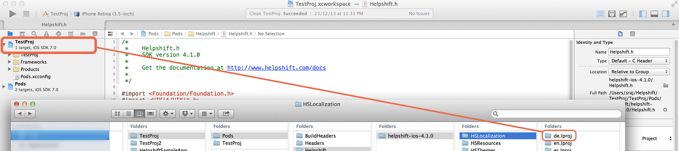 the HSLocalization folder. Drag and drop the corresponding .lproj folders into your project from the directory where Cocoapods saves the Helpshift SDK folder.